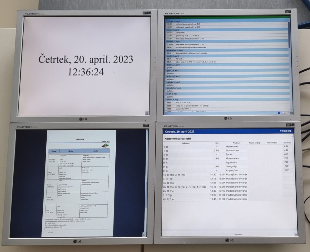 Na osnovni šoli smo imeli že nekaj let nazaj namenski računalnik in namenski televizor, na katerem se je vrtela PowerPoint predstavitev, katero je urejala pomočnica ravnateljice. Ker je bilo delo zamudno, se v to ni vlagalo preveč truda, kasneje pa ja računalnik tudi prenehal z delovanjem. Nekaj časa kasneje, pa smo se odločili, da bi to stvar ponovno obudili. Ker na tej osnovni šoli namiznih računalnikov skoraj ni več, monitorjev je pa malo morje, smo se odločili te monitorje izkoristiti. S temi monitorji in USB na VGA pretvorniki se jih lahko zloži skupaj, priklopi na računalnik in naredi “display wall”.