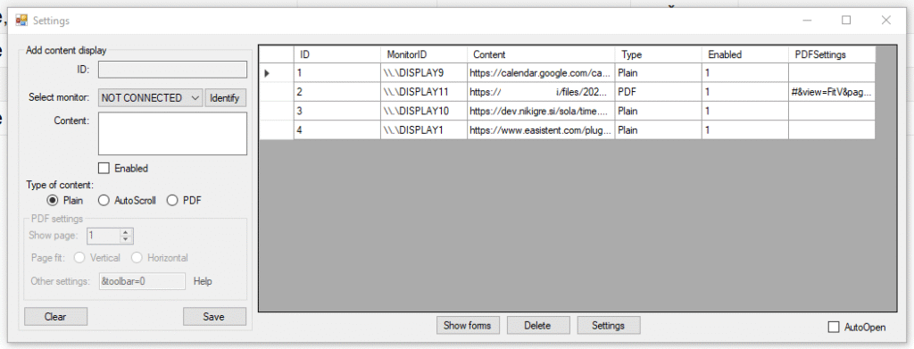 Ko ste pripravljeni prikazovati vsebino na monitorjih, pritisnite “Show forms”. S tem se bo na vseh zaslonih prikazala izbrana vsebina.