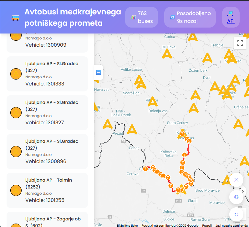 Interaktiven zemljevid, ki prikazuje trenutne lokacije avtobusov po Sloveniji vključno s podatki o njihovi poti in postajah.