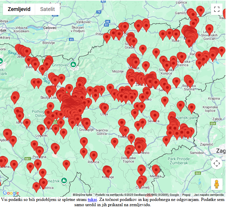 Interaktiven zemljevid, ki prikazuje zaklonišča in njihove lastnike v Sloveniji.