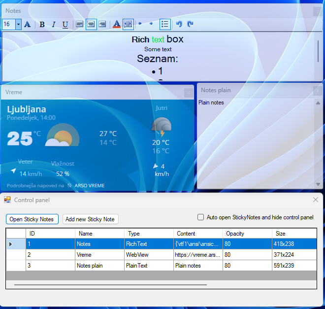 StickyNotes je program za Windows, ki prinaša samolepilne listke treh vrst (PlainText, RichText in WebPage), si zapomni njihovo velikost in lokacijo ter omogoča upravljanje prek nadzorne plošče ali nastavitev ob desnem kliku.